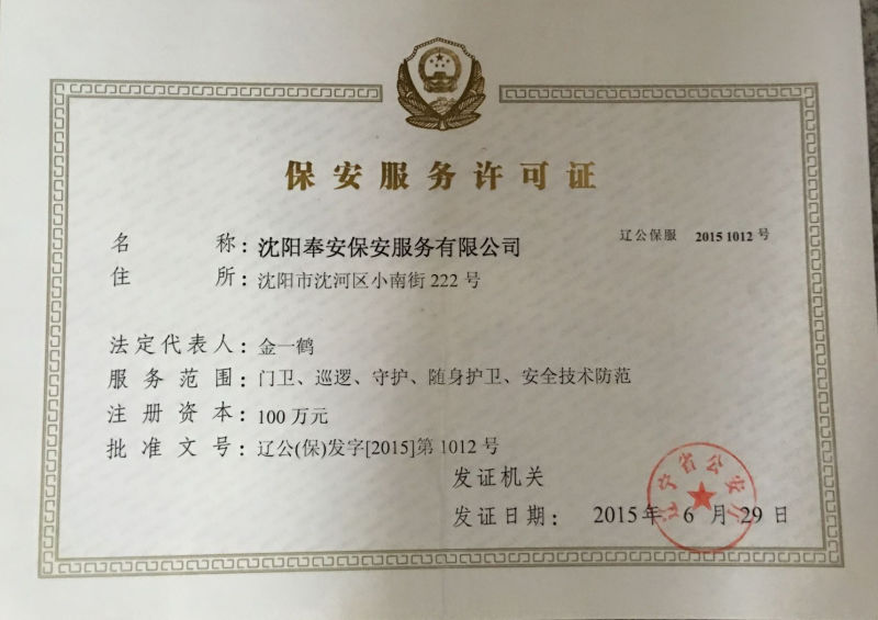 沈陽奉安保安服務有限公司(原沈陽市沈河區(qū)保安服務公司)創(chuàng)建于一九八八年八月,是遼寧省公安廳、沈陽市公安局批準,工商行政部門登記注冊,全市首家具備保安資質(zhì)的特殊性服務企業(yè),隸屬于沈陽市沈河區(qū)政府直管的全民國有企業(yè),現(xiàn)為中國保安協(xié)會會員單位和省保協(xié)、市保協(xié)常務理事單位:在全市同行業(yè)中率先通過ISO國際質(zhì)量認證,是市工商局批準的“重合同守信用”免檢單位和沈陽市政府采購中心保安服務項目重點競標單位;擁有一支專業(yè)化、標準化、職業(yè)化的高素質(zhì)保安隊伍,是公安機關(guān)重要的輔警力量。